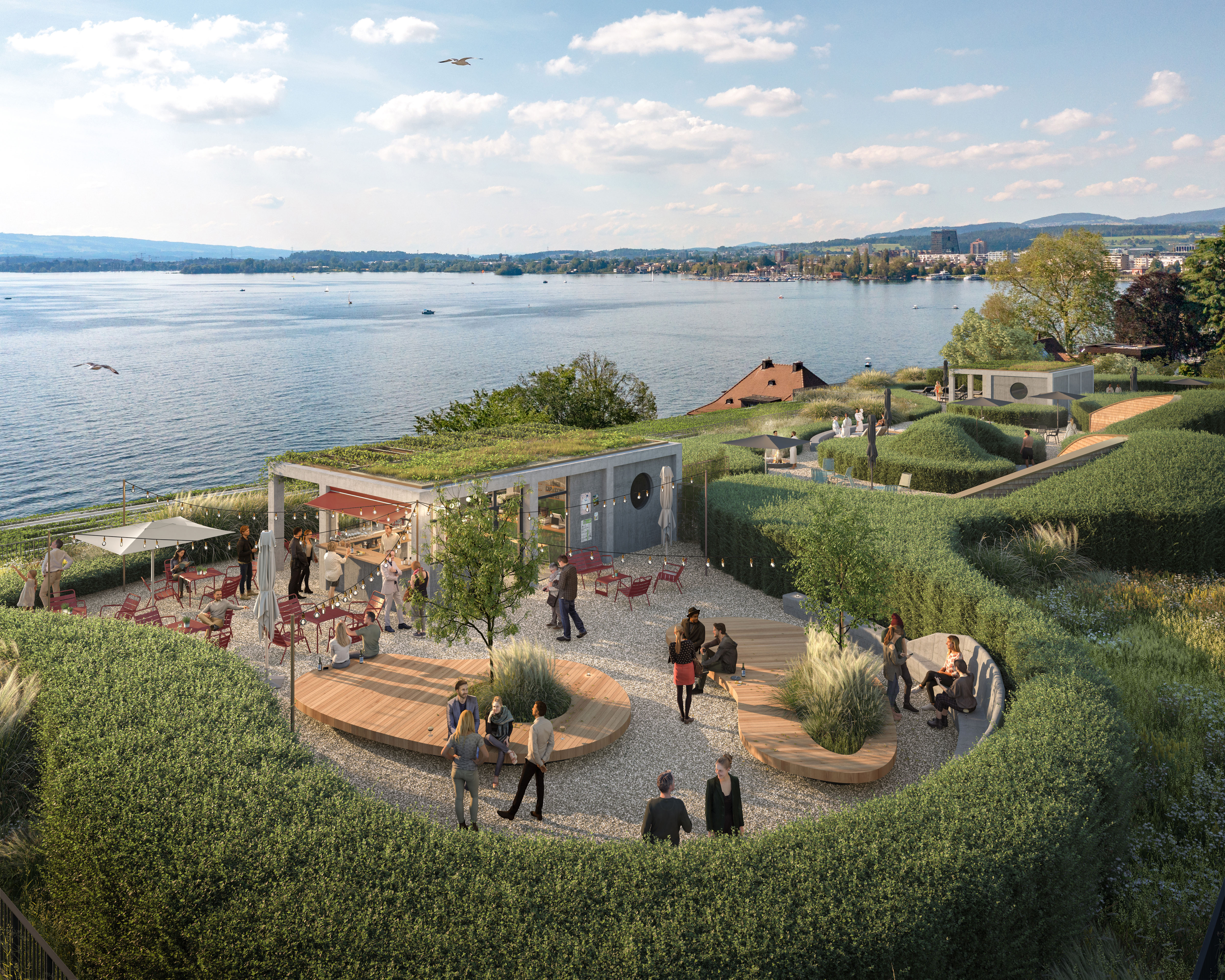 Das Konzept «Süd-See Zug» hat das Beurteilungsgremium am meisten überzeugt. Investor ist die CSA RES Commercial, eine Anlagegruppe der Credit Suisse Anlagestiftung, für das Nutzungskonzept zeichnet die Immobiliendienstleisterin HRS Real Estate AG verantwortlich. «Süd-See Zug» schlägt ein durchgrüntes, lebendiges Stadtquartier am See vor und nimmt die einmalige Gelegenheit wahr, Stadtleben und Naherholung an einem Ort zu vereinen. Die Kombination von Spa, «Süd-See Hub» mit Durchmischung von Handwerk, Kultur und Gewerbe, Boutique-Hotel und kuratierbaren Freiräumen für Kunst, Kultur und Kulinarik schafft die Voraussetzungen, dass sich ein für die Bevölkerung von Stadt und Region Zug ausgesprochen attraktiver Ort entfalten kann. Das Beurteilungsgremium anerkennt das schlüssige Konzept und beurteilt dessen Umsetzung als ausgesprochen realistisch und relevant für Zug. Zentrales Element des Konzepts ist der «Süd-See Hub». Dieser umfasst Räumlichkeiten für Events, Wellness, Gastronomie, Kursräume, Kleingewerbe, Ateliers etc. Mit seinen grosszügigen inneren öffentlichen Räumen schafft der «Süd-See Hub» witterungsgeschützte, ganzjährig nutzbare Aufenthaltsqualitäten. Der öffentliche Dachgarten mit direktem Zugang vom Spa funktioniert als Erweiterung der Bade- und Saunalandschaft mit Blick über den Zugersee und in die Berge. Zusätzlich wird der innere Gastronomiebereich um eine direkt zugängliche Rooftop-Bar ergänzt.