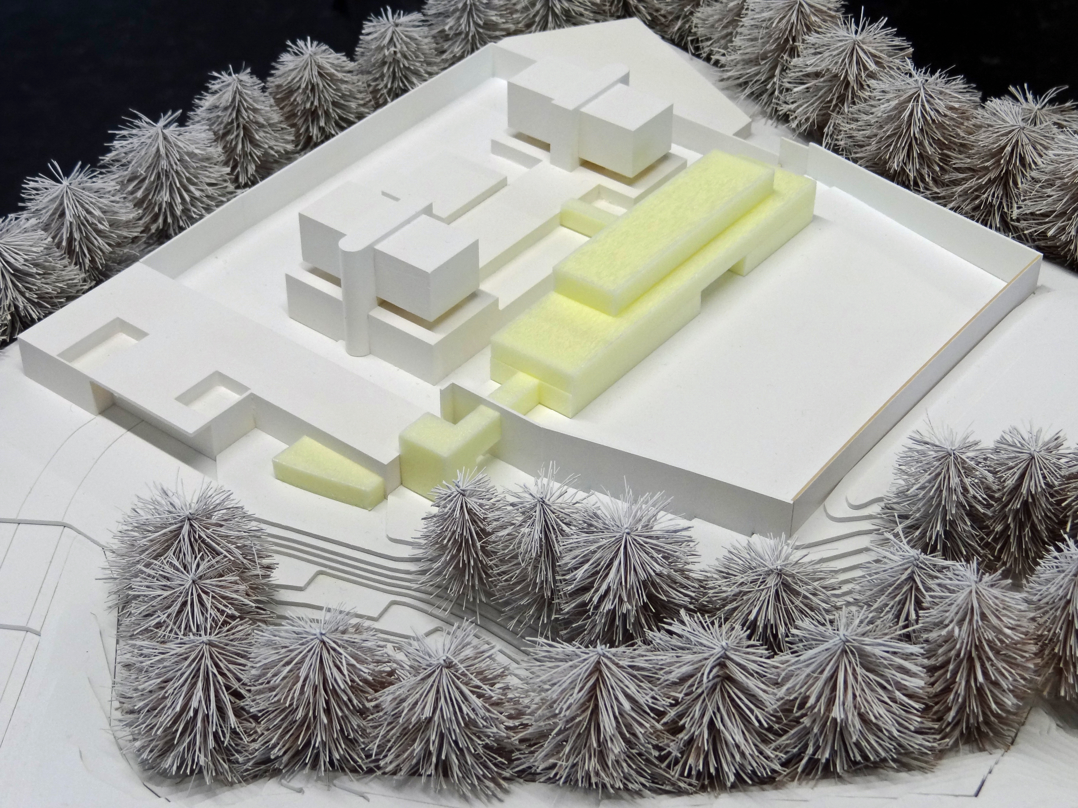 - Modellfoto mit Bestandesbauten (weiss) und Neubauten (gelb)