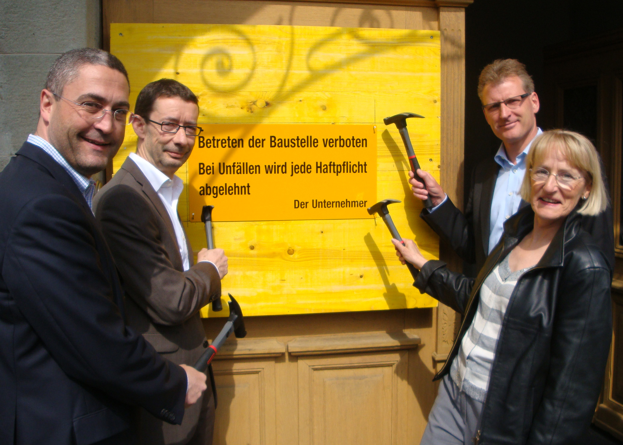 Baubeginn beim Zeughaus Zug: Im Rahmen eines symbolischen Aktes feierten heute Vertretungen von Kanton und Stadt Zug sowie der Gerichte den Auftakt zum Umbau des historischen Gebäudes aus dem Jahr 1897. Dabei kam für einmal nicht der obligate Spaten zum Einsatz, sondern der für Umbauten typischere Hammer. Mit ihm montierten Regierungsrat Heinz Tännler, Stadtrat Ivo Romer, Obergerichtspräsidentin Iris Studer-Milz und Heinz Morf, Leiter der Stadt- und Kantonsbibliothek eine Baustellentafel zum Zeichen des Arbeitsbeginns (Bild).