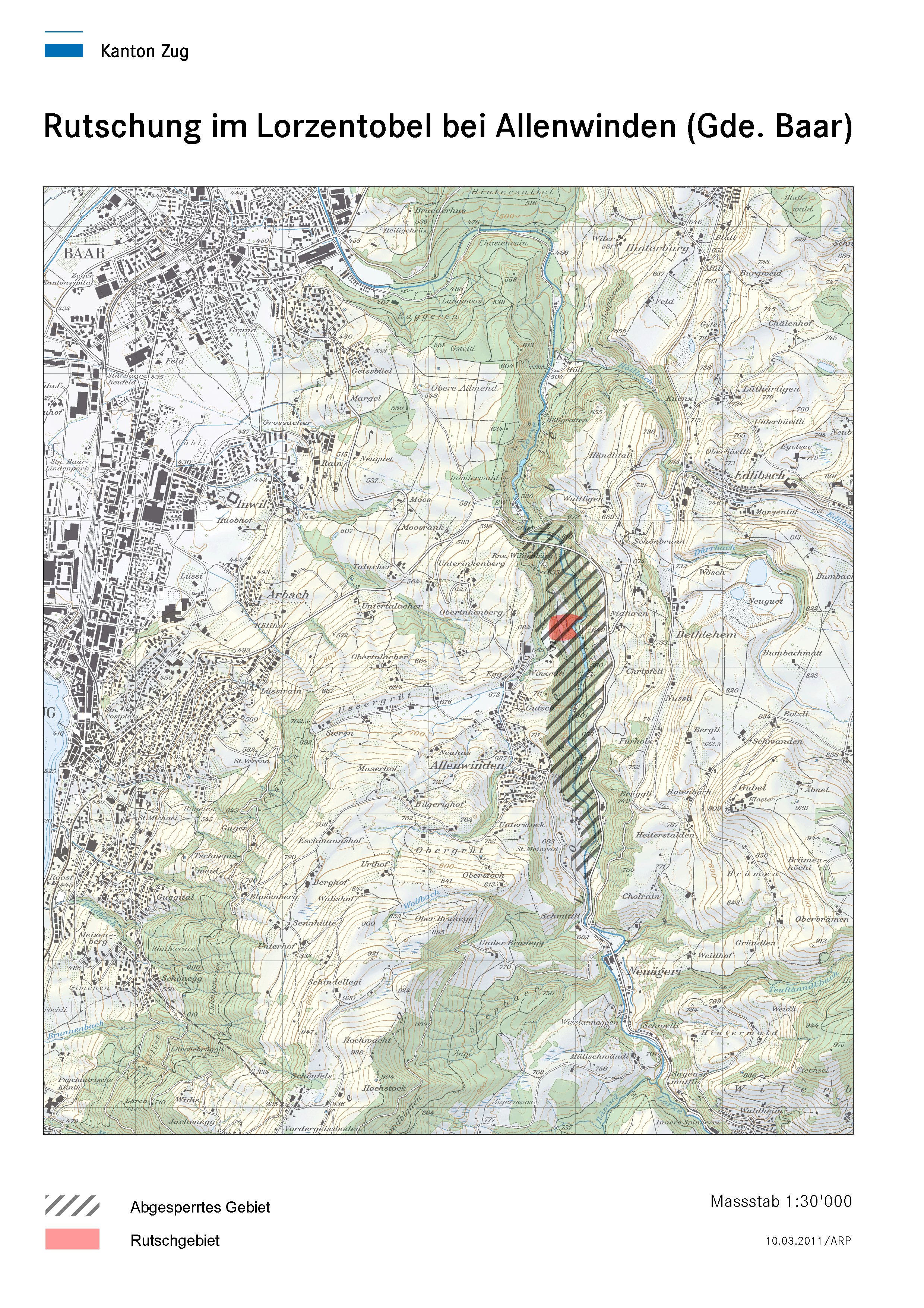 Eine Arbeitsgruppe des Kantons Zug organisiert seit dem 1. März 2011 alle Massnahmen im Zusammenhang mit den Erdrutschen im Lorzentobel (Gemeinde Baar). Baudirektor Heinz Tännler, der die ad hoc-Gruppe leitet, schildert die bisherigen Aktivitäten: "Wir haben zunächst ein Beobachtungs- und Messsystem aufgebaut, um das Geschehen im Rutschgebiet detailliert zu erfassen. Demnach ist der Hang im Gebiet Herrenmatt nach wie vor in Bewegung. Die Materialabbrüche gegen die Lorze hin sind zwar weniger häufig; im Anrissgebiet senkt sich das Terrain jedoch noch immer um rund 10 Zentimeter pro Tag. Für eine Entwarnung und Aufhebung der grossräumigen Sperrung im Lorzentobel ist es somit noch viel zu früh" (s. Kartenbeilage).