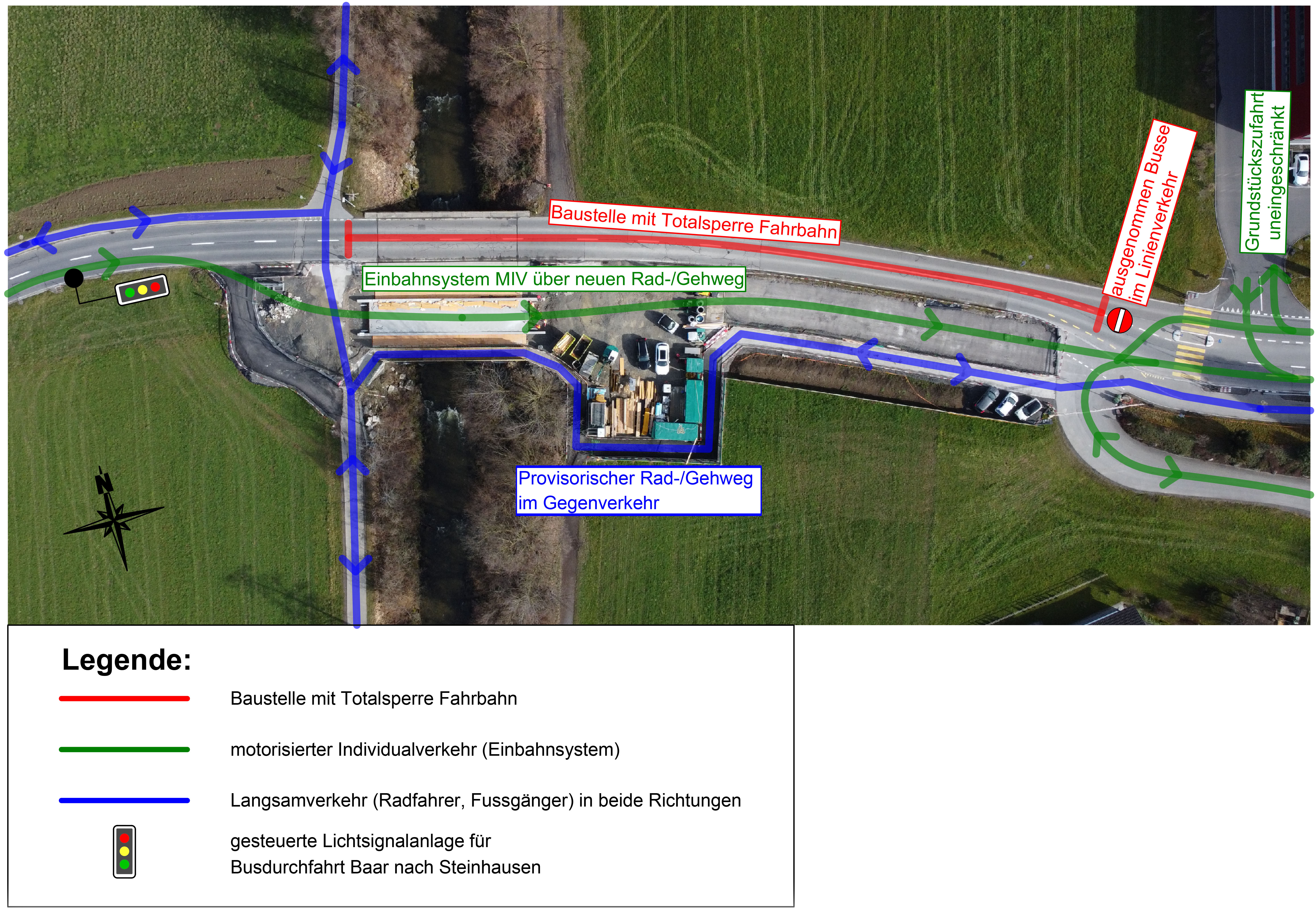 Während den Bauarbeiten wird der motorisierte Individualverkehr vom 17. April bis 12. Mai 2023 im Einbahnregime von Steinhausen nach Baar über den neuen Rad-/Gehweg geführt. Die Fahrt von Baar in Richtung Schochenmühle und Steinhausen wird ab der Einmündung Altgasshof gesperrt. Der Linienbus der Zuger Verkehrsbetriebe verkehrt weiterhin in beide Richtungen. Die Vortrittsregelung erfolgt mittels Lichtsignalanlage. Die Fussgängerinnen und Fussgänger sowie Radfahrerinnen und Radfahrer werden über einen provisorischen Rad-/Gehweg im Gegenverkehr geführt.
