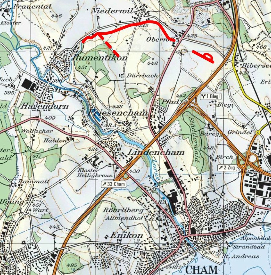 Der Tobelbach in Cham verlief zwischen der Autobahn A4 und Rumentikon kanalisiert auf Betonplatten. Mit einer Renaturierung wurde ein naturnahes Gewässer mit abwechslungsreichen Strukturen und artenreichen Böschungen geschaffen. Eine grosszügige Bachaufweitung im obersten Abschnitt liess den früheren Bibersee auferstehen und setzte einen ökologischen Schwerpunkt in die stark ausgeräumte Landschaft. Weiter wurde der Dürrbach, welcher vor Rumentikon in den Tobelbach mündet, ausgedolt.
