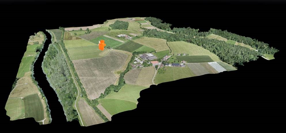 Foto 1: Schrägansicht des Orthofotos, das aus insgesamt 650 Bildern zusammengesetzt wurde. Es zeigt die gesamte abgeflogene Fläche auf dem Gutsbetrieb Chamau.