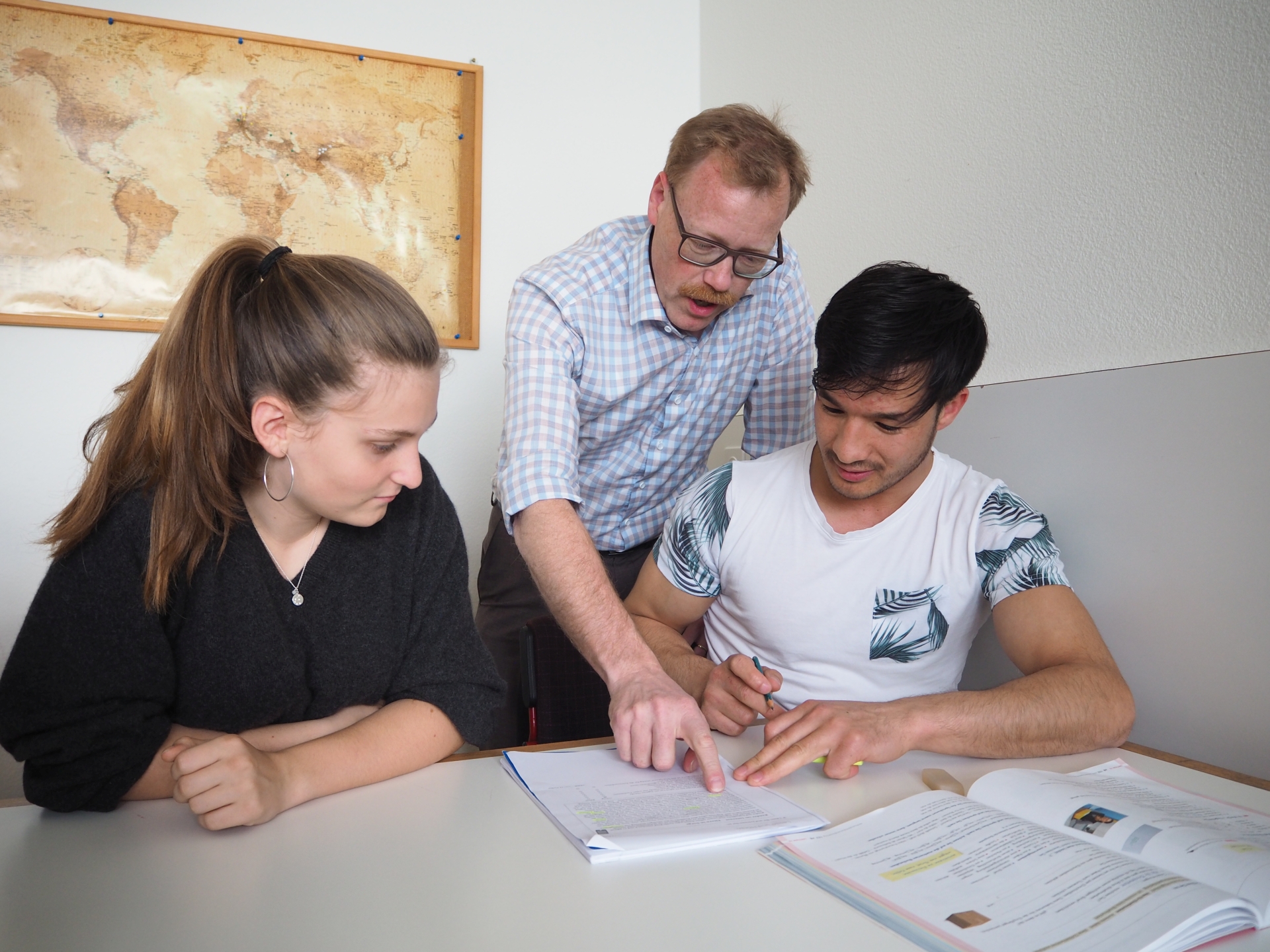Eine Schülerin der International School of Zug and Luzern (ISZL) unterstützt einen afghanischen Flüchtling beim Deutschlernen. Regierungsrat Andreas Hostettler freut sich über die motivierten Lerntandems in der Lernwerkstatt.