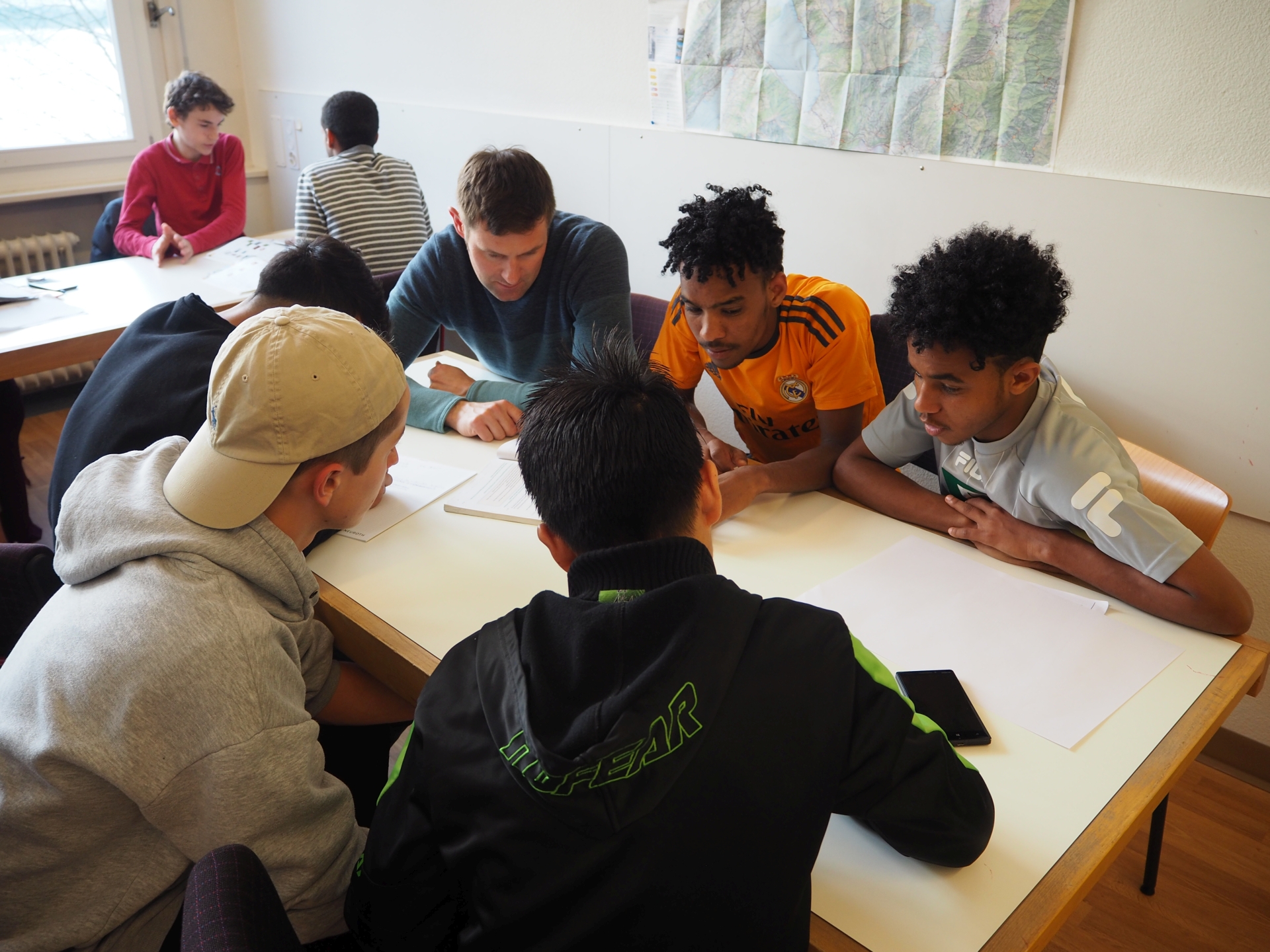 Gemeinsam lernt es sich besser und macht es mehr Spass. Afghanische und eritreische Flüchtlinge lernen zusammen mit einem Lehrer und mit Schülern der International School of Zug and Luzern (ISZL). Vom Austausch profitieren beide Seiten.