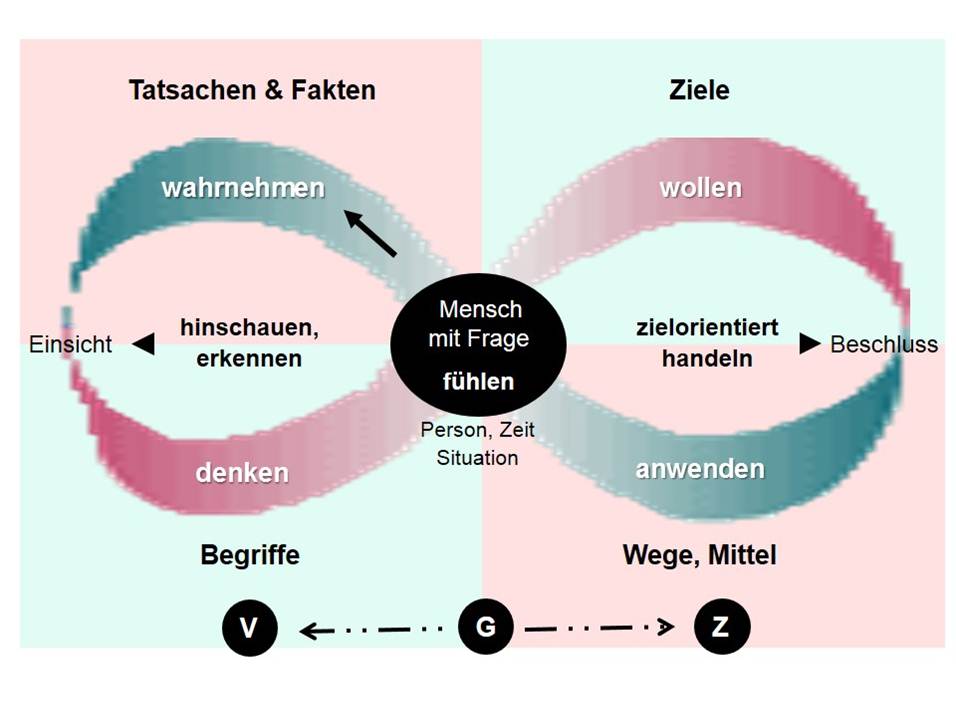 Lex Bos' Dynamische Urteilsbildung (vgl. Bächtold/Supersaxo, 2005) bietet sich als Strukturmodell für Gespräche an, um mit Gesprächspartnerinnen und -partnern zu umsetzungsfähigen Entscheidungen zu gelangen. Das Modell unterstützt ein prozessorientiertes Vorgehen und berücksichtigt, dass gute Entscheidungen und Vereinbarungen in zirkulären Suchprozessen gewonnen werden. Vier Bereiche kennzeichnen diesen Prozess: