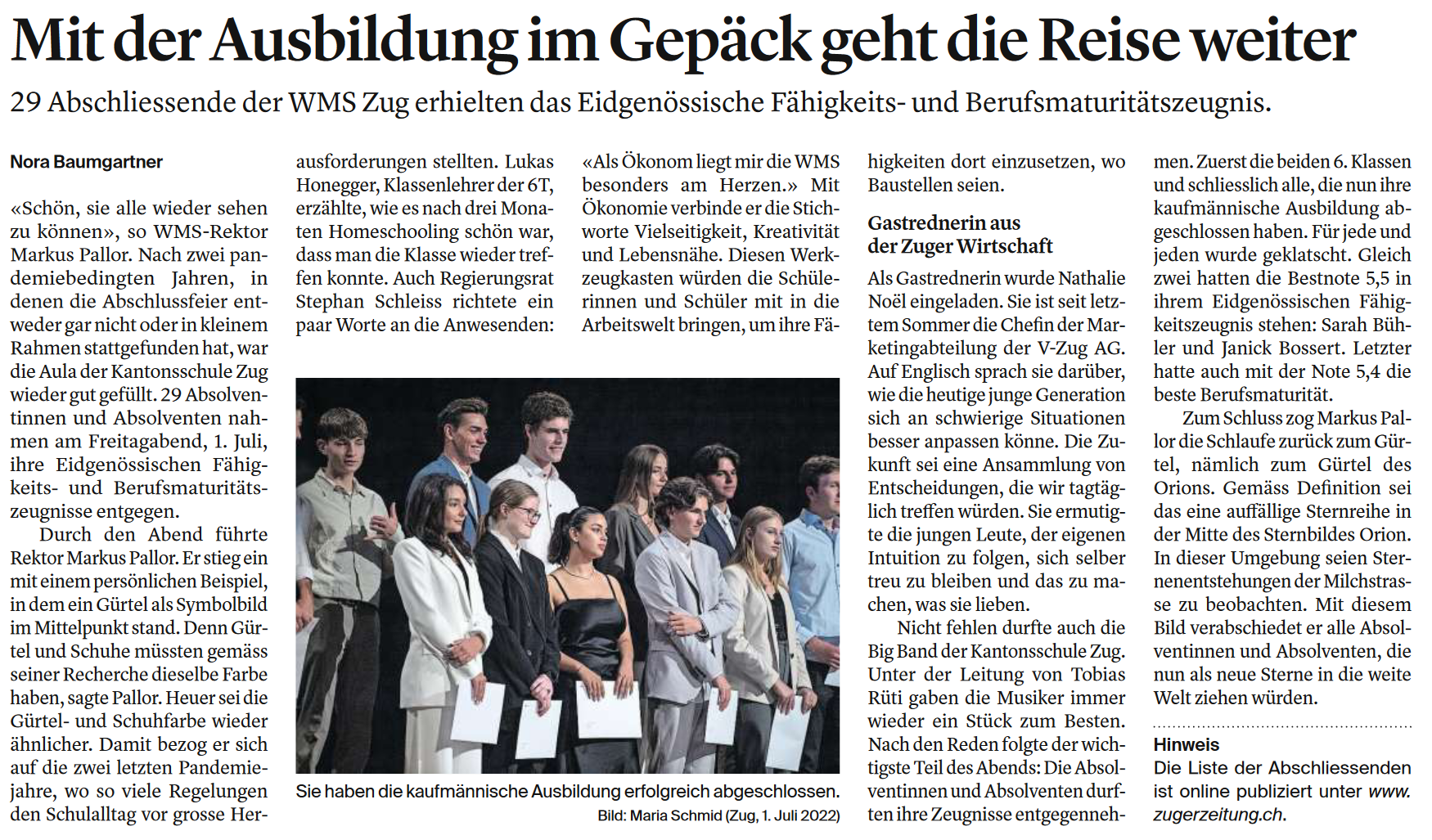 Am 1. Juli 2022 erhielten die Absolventinnen und Absolventen des schulischen Teils der Ausbildung ihre Zwischenberichte, die Praktikantinnen und Praktikanten des Jahrespraktikums ihre Fähigkeits- und Berufsmaturitätszeugnisse ausgehändigt.
