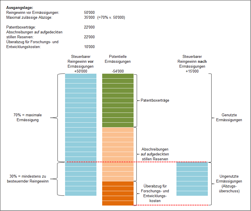 Übersteigen die theoretisch möglichen steuerlichen Ermässigungen die Maximalbeschränkung von 70 %, spricht man von einem Abzugsüberschuss. Dieser Abzugsüberschuss kann steuerlich nicht geltend gemacht werden. In Konstellationen, in denen ein Abzugsüberschuss resultiert, in denen also die einzelnen Ermässigungen kumuliert mehr als 70 % des Reingewinns erreichen, sind die steuerlichen Ermässigungen in folgender Reihenfolge zu kürzen: