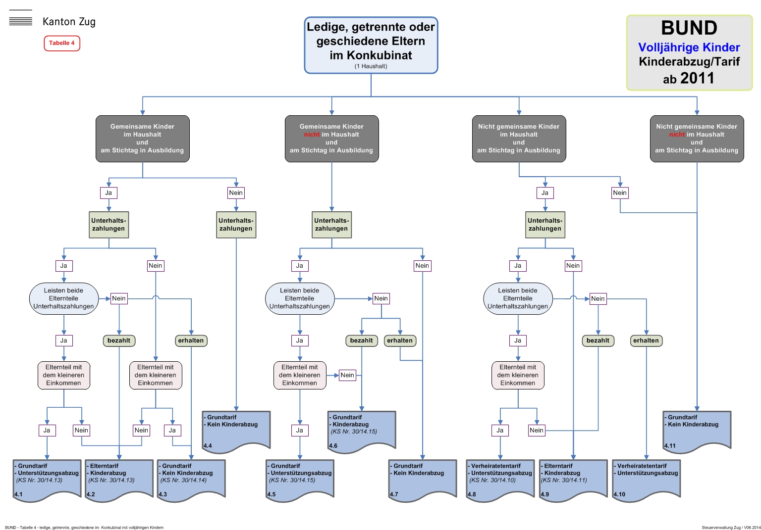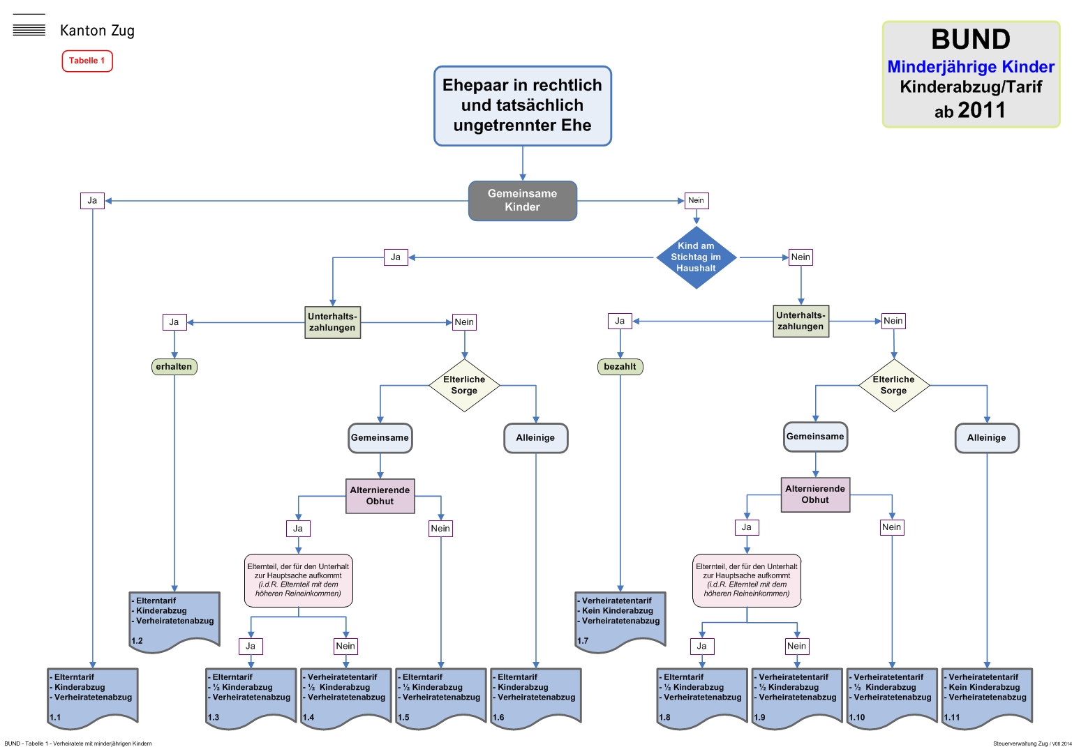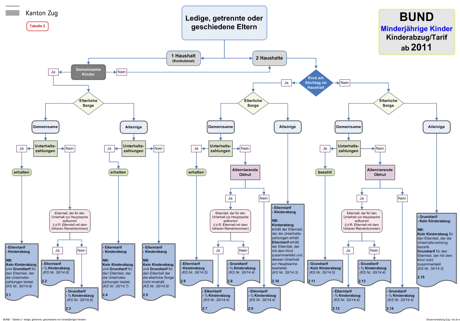 In den nachfolgenden Tabellen werden anhand der verschiedenen Familienkonstellationen die massgebenden Beurteilungskriterien im Zusammenhang mit der Gewährung des Kinderabzuges und der Festlegung des anwendbaren Tarifs im Detail aufgeführt.