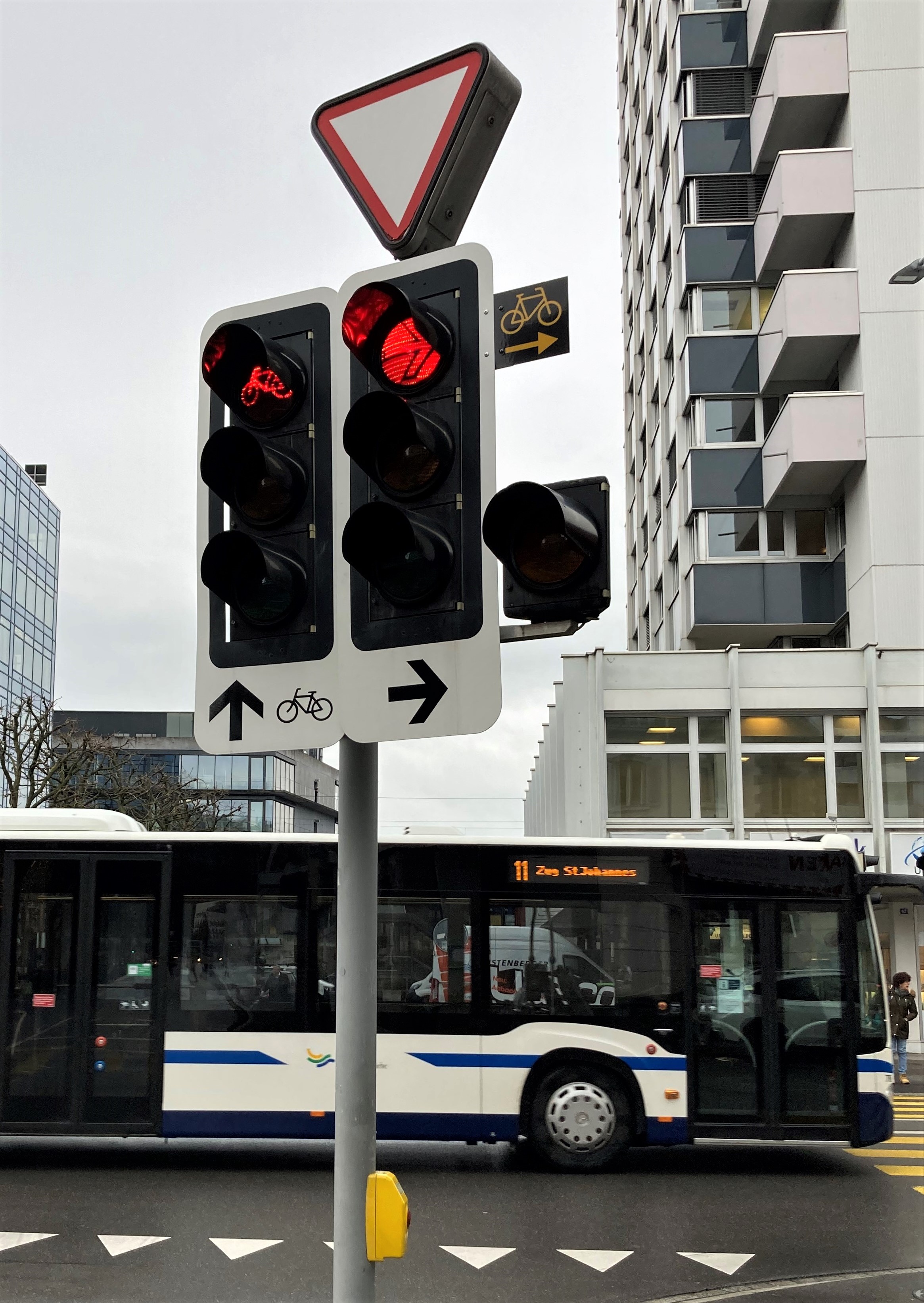 Seit Januar 2021 ist für Velos, e-Bikes und Mofas das Rechtsabbiegen bei Rotlicht an Verkehrsknoten erlaubt, wenn sie entsprechend signalisiert sind. Wo dies ohne Gefahren möglich ist, sind die Signalisationen in den letzten Tagen angebracht worden (Zusatzschilder neben den Rotlichtern; gelbes Velo und gelber Pfeil auf schwarzem Grund).