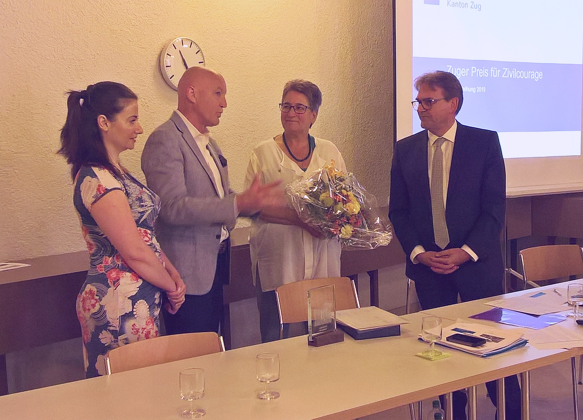 Die Sicherheitsdirektion und die Sicherheitsvorstehenden der Zuger Gemeinden bedanken sich bei Herrn Bassi für seinen beherzten Einsatz. Sie verleihen ihm dafür den mit 1000 Franken dotierten «Zuger Preis für Zivilcourage». Regierungsrat Beat Villiger und die Menzinger Gemeinderätin Barbara Beck-Iselin, Vorsteherin der Sicherheitsverantwortlichen der Zuger Einwohnergemeinden, haben ihm heute in Menzingen den Preis und eine Urkunde überreicht.