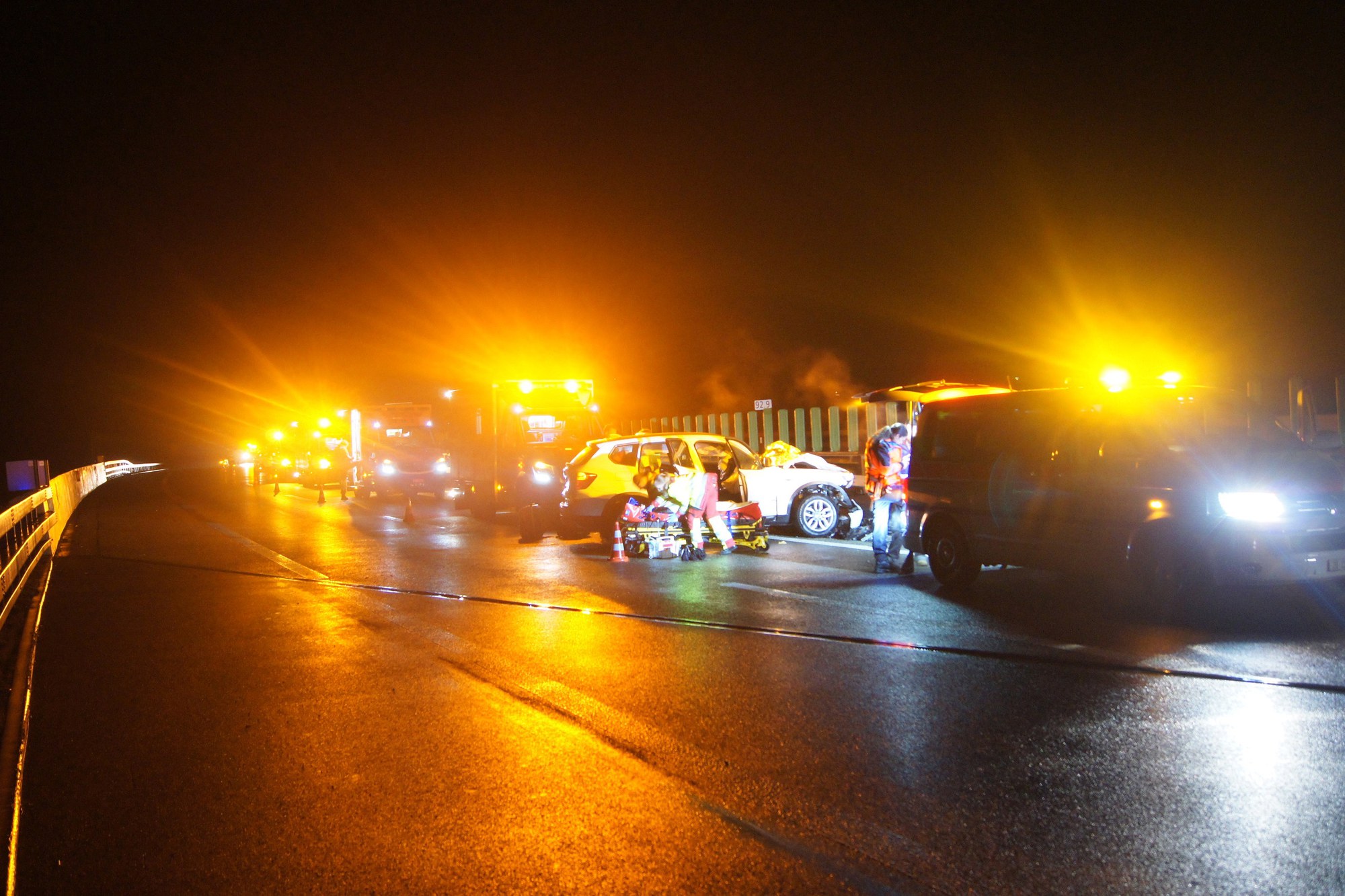 Am frühen Montagmorgen (12. Februar 2018), kurz nach 01:30 Uhr, fuhr ein 45-jähriger Chinese und vier weitere Insassen im Auto auf der Autobahn A4 in Richtung Zürich. Höhe Bibersee verlor der Lenker aus noch ungeklärten Gründen die Herrschaft über sein Fahrzeug. Er kollidierte zuerst mit der Wand auf der rechten Seite neben der Fahrbahn, dann mit der Mittelleitplanke und kam schliesslich auf dem Überholstreifen, quer zur Fahrbahn, zum Stehen. Alle vier Mitfahrer im Alter zwischen 43 und 58 Jahren wurden leicht bis mittelschwer verletzt. Sie wurden von verschiedenen Rettungsdiensten betreut und ins Spital eingeliefert. Der Lenker kam mit dem Schrecken davon. Am Auto entstand Totalschaden, auch die Leiteinrichtung wurde stark beeinträchtigt. Der Gesamtschaden beläuft sich auf rund 60'000 Franken. Der Unfallabschnitt war kurzzeitig nur eingeschränkt befahrbar.