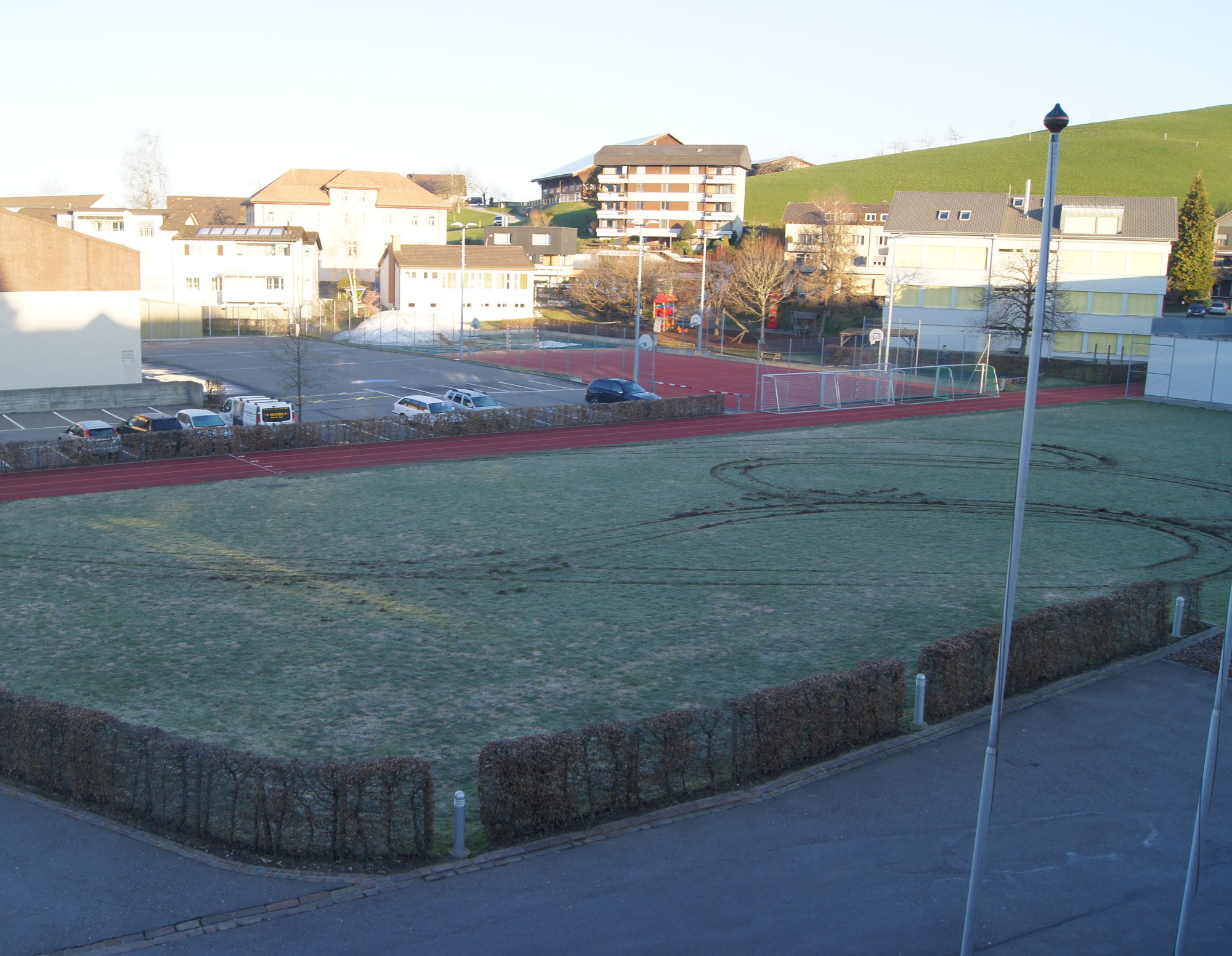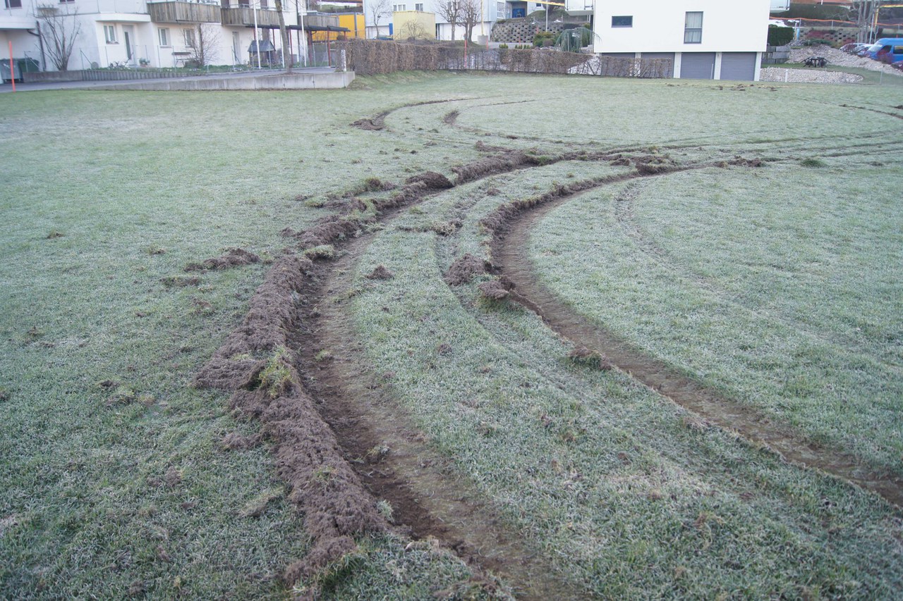 In der Nacht auf Samstag (23. März 2019) sind Unbekannte mit einem Fahrzeug über das Schulhausareal Schützenmatt/Ochsenmatt in Menzingen gefahren. Die unerlaubte Fahrt hat tiefe Spurrillen im Rasen hinterlassen und einen Sachschaden von einigen Tausend Franken verursacht.