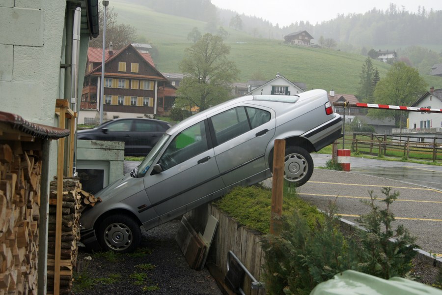 Die beiden Fahrzeuginsassen blieben unverletzt. Das Auto erlitt kleinere Schäden an der Front und am Unterboden. Ebenfalls wurde ein Kaminrohr des Gebäudes in Mitleidenschaft gezogen.