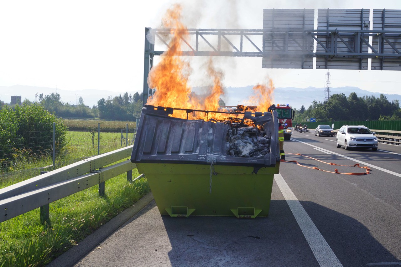 Während der Fahrt ist der Inhalt einer Baumulde in Brand geraten. Verletzt wurde niemand. Ein Fahrzeuglenker, der während der Fahrt mit dem Handy Aufnahmen vom Brand machte, wird zur Anzeige gebracht.