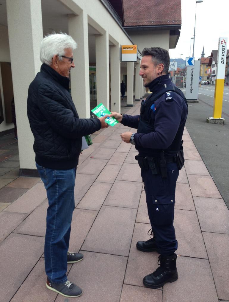 Um die Bevölkerung zu sensibilisieren und sie als Partner zu gewinnen, sind unsere Einsatzkräfte in diesen Tagen auf den Strassen und in den Gemeinden sehr präsent. Sie führen dabei Gespräche mit Bürgerinnen und Bürger und beschenken sie mit einer kleinen Tafel Schokolade, die mit den Verhaltensmassnahmen bei verdächtigen Wahrnehmungen versehen ist.
