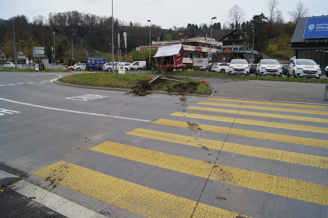 Am Freitag (10. November 2017), gegen 11:50 Uhr, stoppte ein Chauffeur seinen Lastwagen mit Auflieger an einer Tankstelle in Sihlbrugg. Als er ausstieg, setzte sich der Sattelschlepper, befüllt mit 24 Tonnen Benzin, plötzlich in Bewegung und rollte rund 70 Meter rückwärts. Dabei überquerte das Gefährt im Bereich des Fussgängerstreifens beide Fahrbahnen der Zugerstrasse in Neuheim, knickte einen Baum um und kam schliesslich mit der Hinterachse des Aufliegers im Wiesland zum Stillstand. Glücklicherweise kam es zu keiner Kollision mit Fussgängern und Fahrzeugen. Der 50-jährige Chauffeur fuhr anschliessend zurück zur Tankstelle. Eine zufällig vorbeifahrende Polizeipatrouille entdeckte wenige Minuten später die Spuren auf den Fahrbahnen. Die Polizisten sprachen den Chauffeur auf die Unfallsituation an. Der Mann stand unter Schock, ihm wurde bewusst wie viel Glück im Unglück er hatte. Der fehlbare Lenker muss sich vor der Staatsanwaltschaft des Kantons Zug verantworten. Der entstandene Sachschaden beträgt rund 4000 Franken.