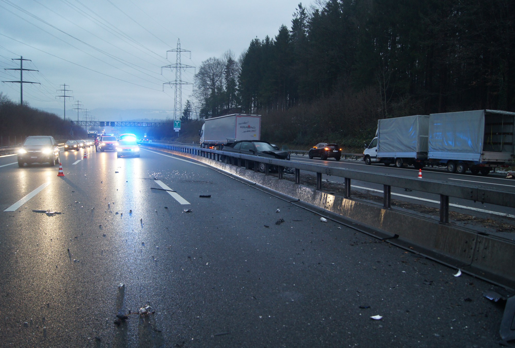 Während der Bergung, der Fahrbahnreinigung und der Instandstellung der massiv beschädigten Leiteinrichtung musste der Verkehr in beiden Richtungen einspurig an der Unfallstelle vorbeigeführt werden. Dies führte zu einem längeren Rückstau im Feierabendverkehr.
