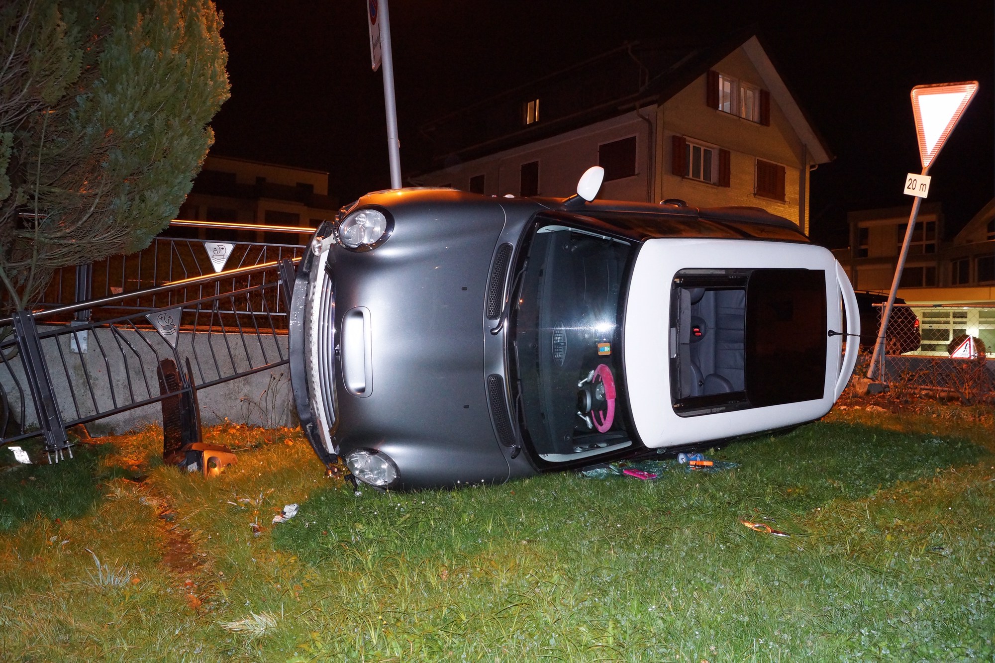 Am Mittwochabend (28. November 2018), kurz vor 22:00 Uhr, ist eine 18-jährige Junglenkerin in Unterägeri beim Abbiegen von der Zugerstrasse in die Neuschellstrasse verunglückt. Aus bisher ungeklärten Gründen geriet sie auf das rechtsseitige Trottoir. Um eine Kollision mit dem Gartenzaun zu vermeiden, lenkte sie stark nach links, überquerte die Strasse und durchbrach den Zaun auf der gegenüberliegenden Strassenseite. Das Auto stürzte gut einen halben Meter in die Tiefe und kam schliesslich auf der Fahrerseite liegend in einem Garten zum Stillstand.