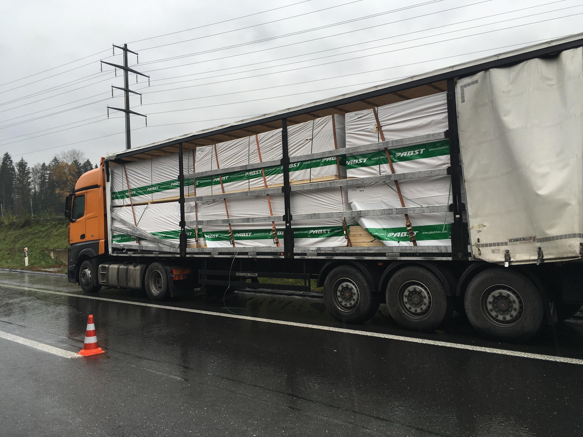 Bei einem Bremsmanöver geriet die Holzladung eines Sattelmotorfahrzeugs ins Rutschen. Der Chauffeur blieb unverletzt. Die Einsatzkräfte stellten bei der Überprüfung der Betriebssicherheit am Fahrzeug zudem Mängel fest.