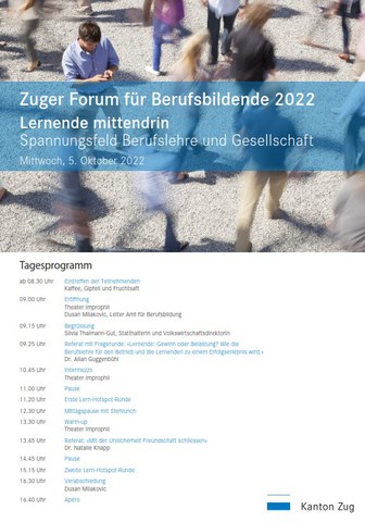 Nach einem kurzen Inputreferat zum Thema werden wir in Kleingruppen konkrete Situationen aus dem Berufsalltag bearbeiten, in welchen Berufsbildende mit (psychischen) Belastungen von Lernenden konfrontiert sind. Anschliessend entwickeln wir im Plenum Lösungsansätze, definieren erste Veränderungsschritte und diskutieren über Zuständigkeiten. Konkrete, anonymisierte Beispielsituationen sind sehr erwünscht und können bis Mitte September an beat.unternaehrer@zg.ch eingereicht werden.