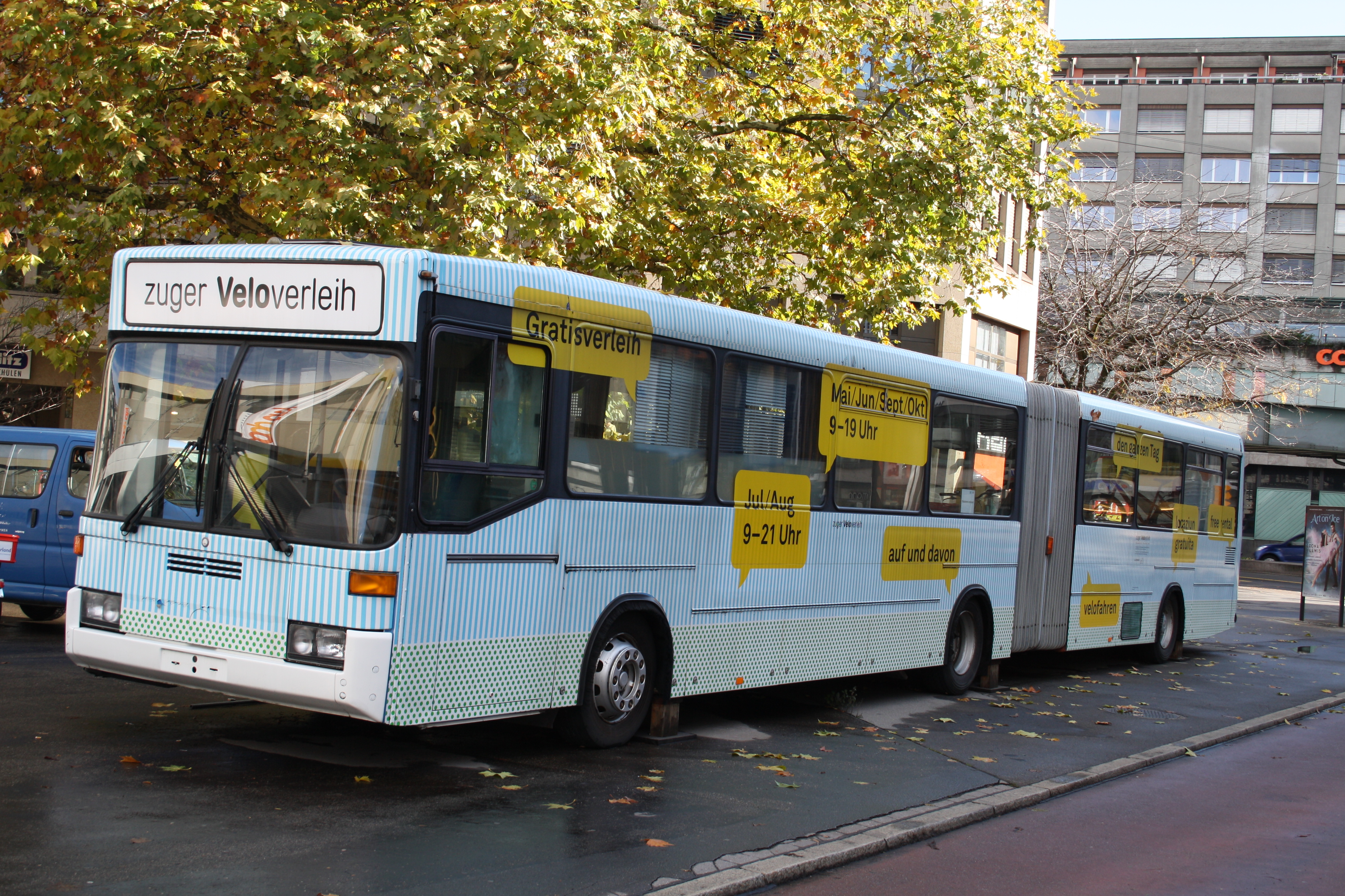 Der Bus des Veloverleihs Zug beendet mit der 18. Saison auch seinen letzten Auftritt am Bundesplatz. Esther Staub, Leiterin Halle 44, begründet: «Wegen den Bauarbeiten im 2013 wurde ein neuer Standort für den Velobus in Zug evaluiert. Wir bedanken uns für die gewährte Gastfreundschaft und freuen uns, dass mit der Stadt Zug eine Lösung gefunden werden konnte. Die Verhandlungen sind abgeschlossen, die politischen Entscheide stehen noch bevor». Auch in Zug wird der Gelenkbus durch einen neu eingerichteten Anhänger (wie am Standort Cham) ersetzt. Esther Staub erklärt: «Wir hoffen natürlich, dass das sensationelle Ergebnis mit 5042 Ausleihungen in Zug, das ist ein sagenhaftes Plus von 1063, am neuen Standort ebenfalls erreicht werden kann.»